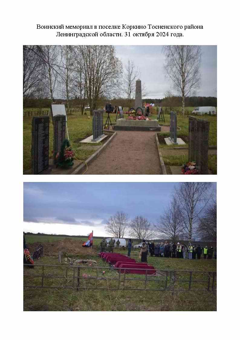 Останки с воинскими почестями похоронены 31 октября 2024 года в братской могиле в деревне Коркино Тосненского района Ленинградской области.