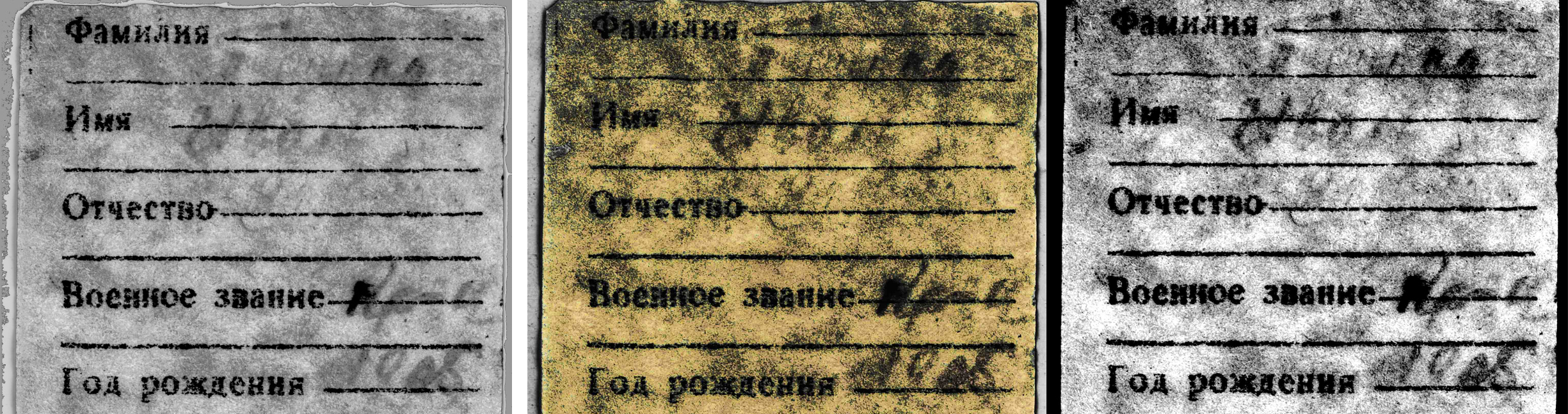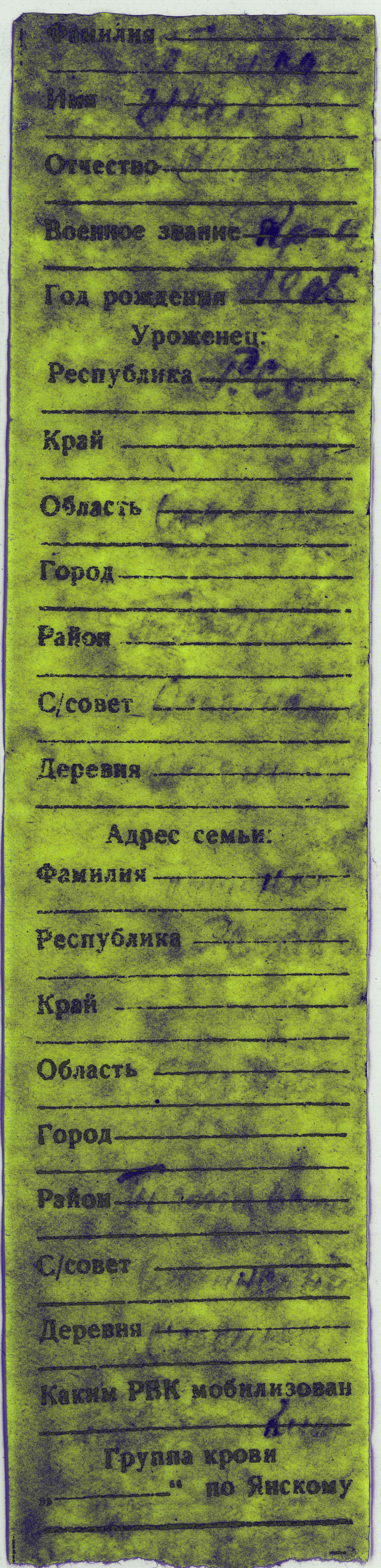 Сканированием на сканере Epson V600 и компьютерной обработкой изображения уверенно прочитались имя воина Иван, год рождения 1905, место рождения и адрес семьи: Омская область, Полтавский район, Ольгинский сельсовет, село Ольгино. В фамилии с некоторой вероятностью угадывались первая буква Т и окончание «...нко», в отчестве — первые две буквы «Ма...». А вот вторая половинка вкладыша оказалась не заполненной.