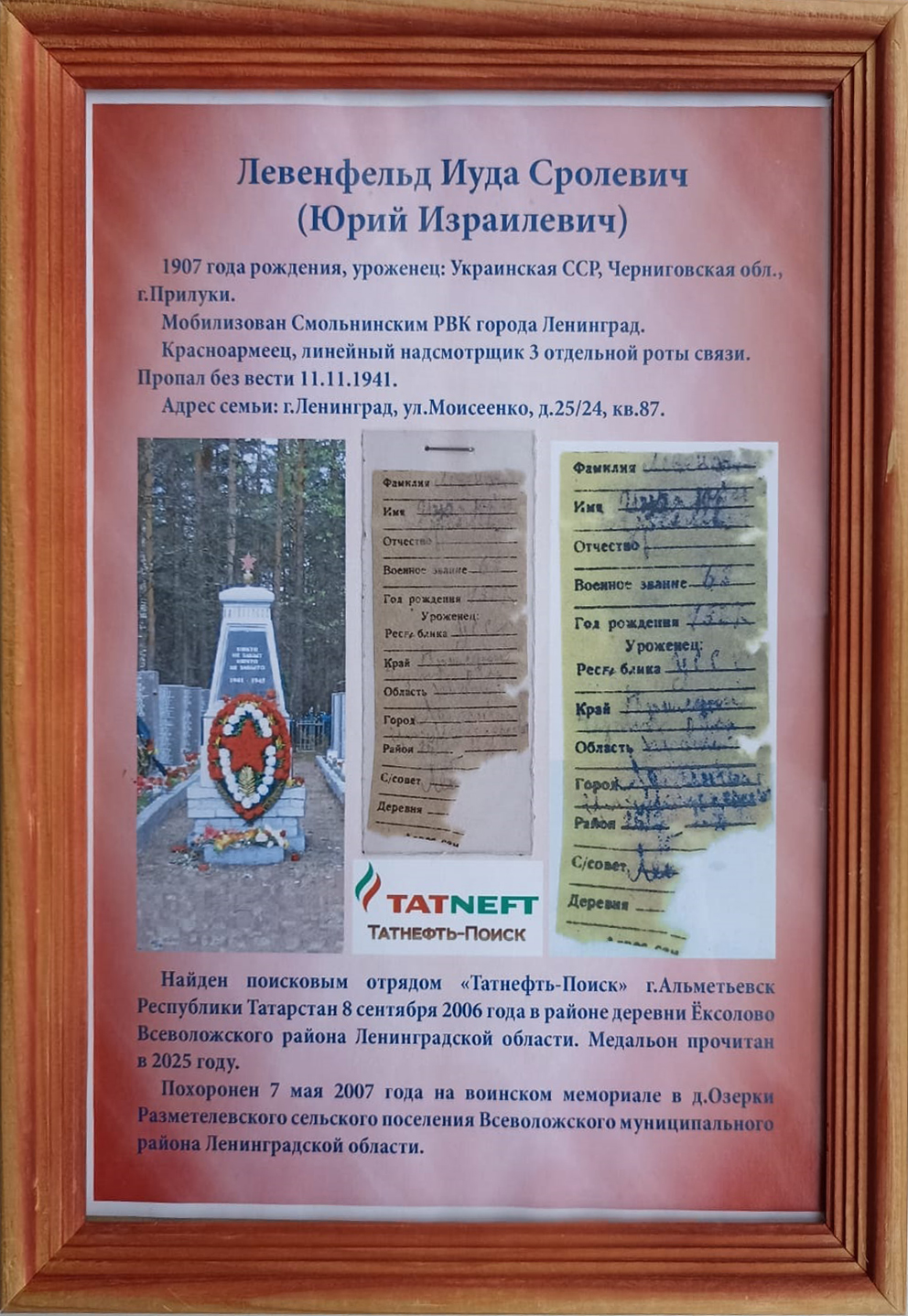 Его останки и медальон были найдены еще в 2006 году поисковым отрядом «Татнефть-Поиск» (г.Альметьевск Республики Татарстан) во Всеволожском районе Ленинградской области. Записи на вклыдыше частичной сохранности прочитаны в ВИПЦ в 2025 году. То ли записи всё-таки со временем немного проявляются, или просто технические средства сканирования и обработки становятся более совершенными.