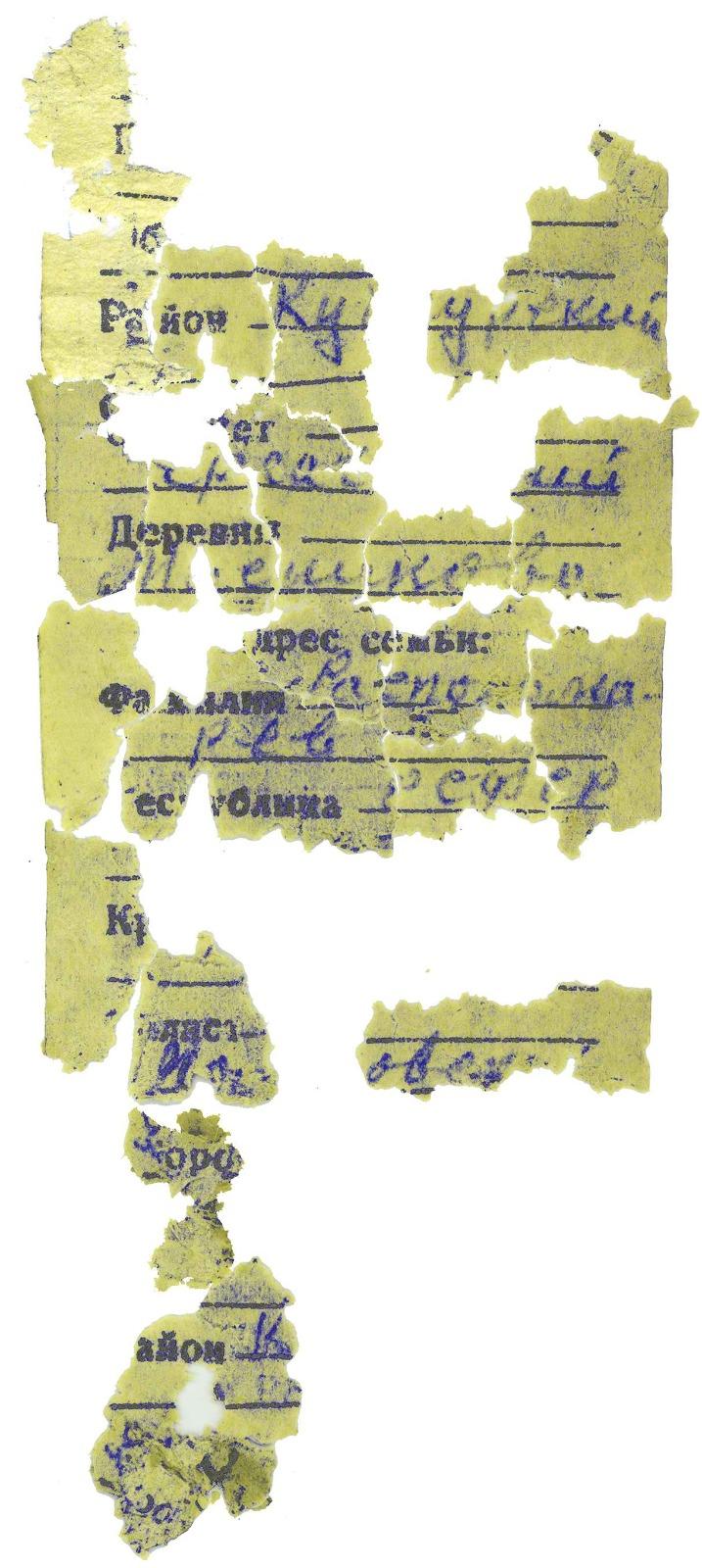 Вкладыш медальона поступил в ВИПЦ на экспертизу в размазанном на листочке виде обрывками в 3–4 слоя. Представленное изображение собрано последовательным сканированием кусочков перед отслоением очередного слоя. После расслоения всех сохранившихся частей, в бумажном виде представляет из себя мелкие кусочки. Но, на удачу, записи сохранились хорошо.