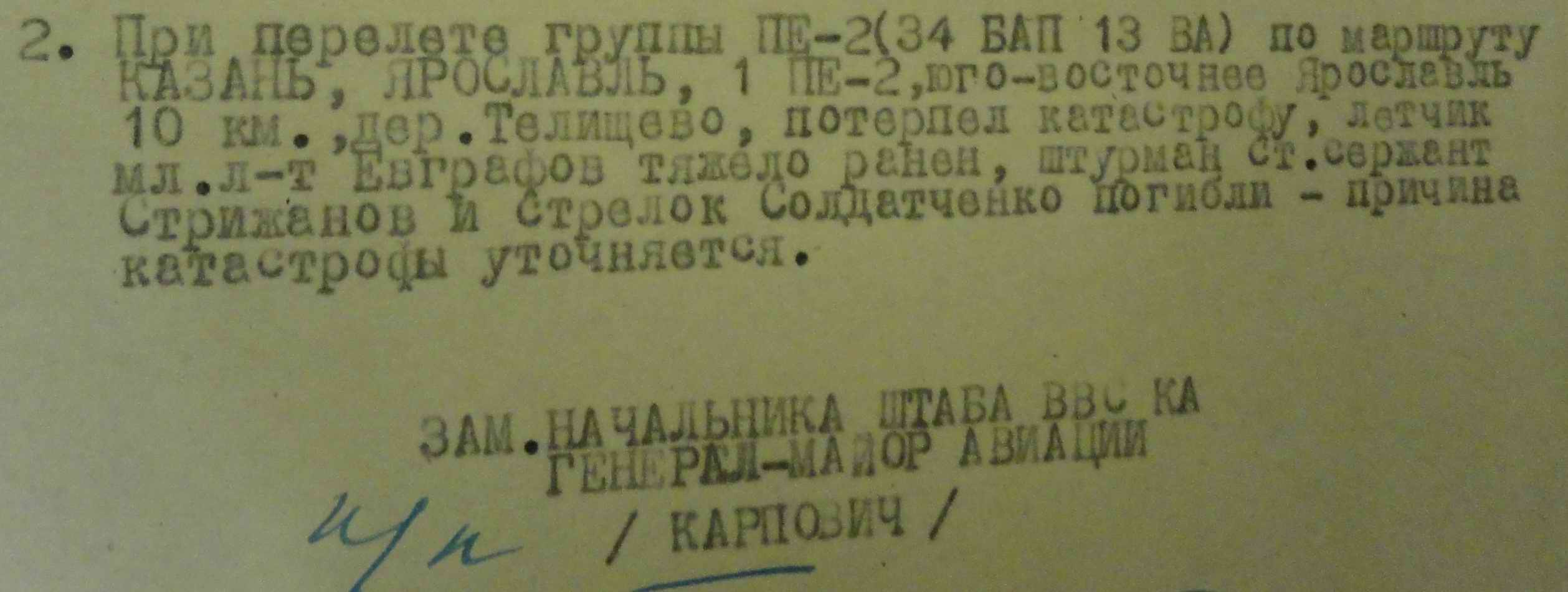 «…При перелете группы Пе-2 (34 гв.БАП 13 ВА) по маршруту Казань-Ярославль, один Пе-2, юго-восточнее Ярославль 10 км, д.Телищево, потерпел катастрофу. Летчик младший лейтенант Евграфов тяжело ранен, штурман старший сержант Стрижанов и стрелок Солдатченко погибли – причина катастрофы уточняется…».
