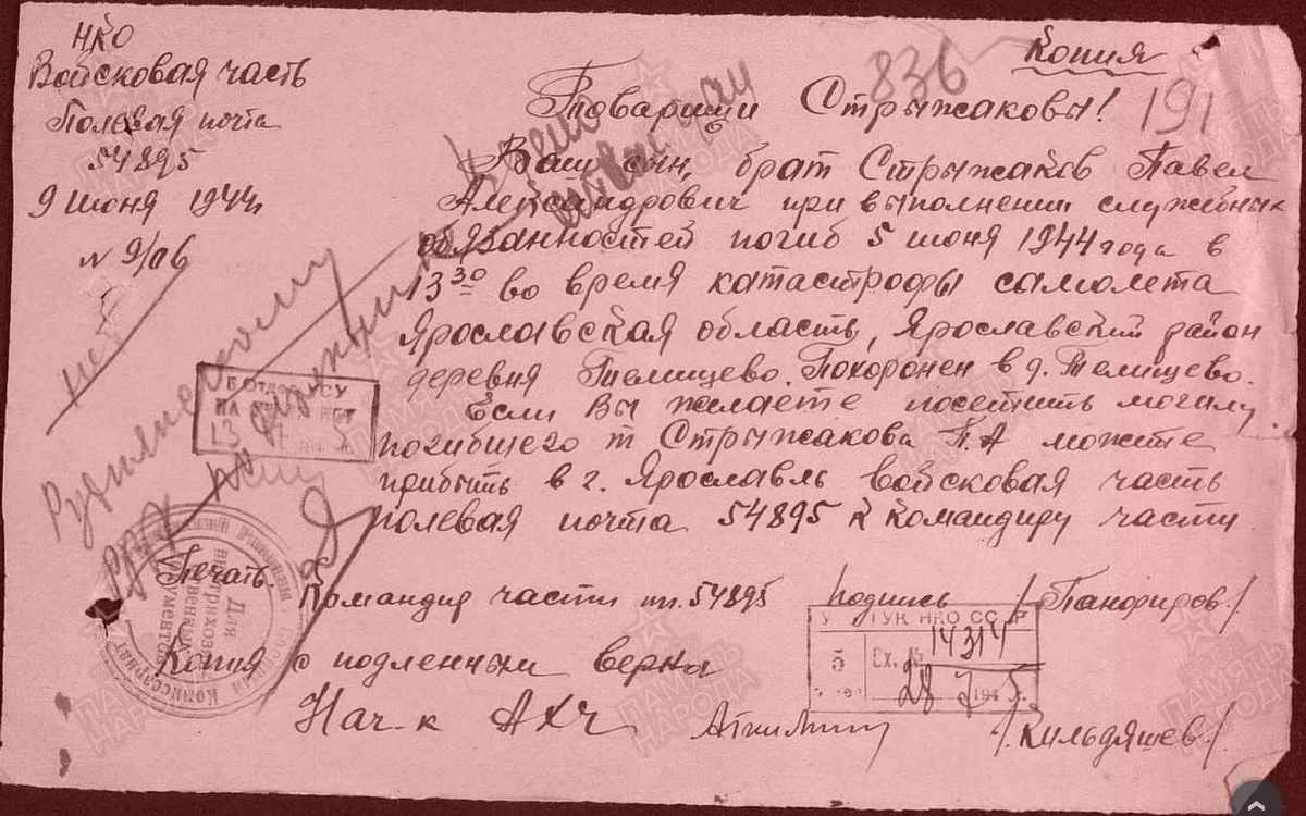 «…Ваш сын, брат Стрыжаков Павел Александрович при выполнении служебных обязанностей погиб 5 июня 1944 года в 13.30 во время катастрофы самолета Ярославская область, Ярославский район, деревня Телищево. Похоронен в д.Телищево.