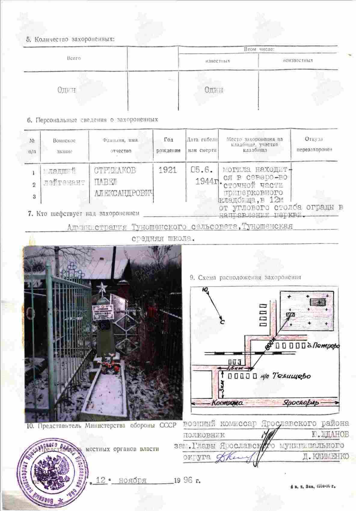Но, как оказалось далее, эти документы в архиве Минобороны России оказались не единственными. Установив дополнительные поисковые опции в системе «Память Народа», уже по месту гибели, удалось выйти на следующий пласт документов, которые уточняли фамилию штурмана и указывали точное место его захоронения. Так, в нашем распоряжении появилась переписка Ярославского РВК Ярославской области с родными Павла Александровича. В этих документах выяснилось, что правильная фамилия погибшего, не Стрижанов, и не Стрыжаков, а – Стрижаков. Оказывается, что еще в 1971 году мать Павла Александровича – Анна Ивановна Стрижакова, обратилась в адрес военкома с просьбой сообщить о состоянии могилы своего сына. И для Ярославского райвоенкома это было открытием. Благодаря этому обращению, также удалось выяснить, что географически могила погибшего штурмана самолета, в действительности находится в д.Петрово, рядом с Петропавловской церковью. Дело в том, что деревни Телищево и Петрово соседствуют друг с другом, и их разделяет всего лишь железная дорога, идущая из Ярославля на Нерехту. А старое кладбище, которое использовалось в военные годы, как раз и находится в деревне Петрово. Так, благодаря этой переписке, могила штурмана самолета 58-го бомбардировочного авиационного полка младшего лейтенанта Павла Александровича Стрижакова была поставлена на государственный учет как воинское захоронение. Это подтверждается и размещенными на сайте «Память Народа» двумя учетными карточками воинского захоронения от 1996 и 2011 годов. Кроме этого, необходимо добавить, что данное захоронение находится в северо-восточной части прицерковного кладбища, в 12 метрах от углового столба ограды в направлении Петропавловской церкви.