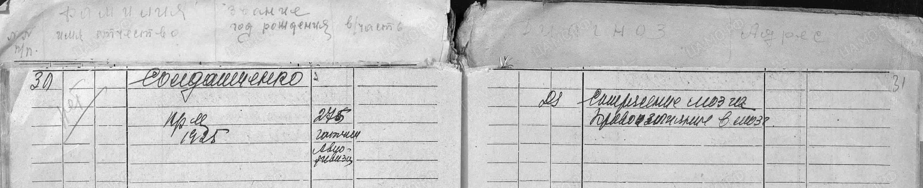 «…красноармеец Солдатченко (имя, отчество – не указано) 1925 года рождения, военнослужащий 276-й Гатчинской авиационной дивизии, умер от сотрясения и кровоизлияния в мозг в июне 1944 года…».
