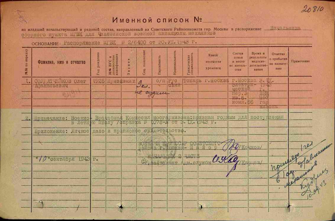 Лишь можно предположить, что речь идет о военнослужащем Солдатченкове Олеге Афанасьевиче 1925 года рождения, уроженце города Москвы (адрес проживания до призыва: г.Москва, Электрический переулок, д.6, ком.56). На данного воина сохранились лишь всего два документа: Донесение военного комиссара Советского РВК города Москвы, что призывник Солдатченков О.А., врачебной комиссией Московского гарнизона от 3 сентября 1943 года признан годным для поступления в летную школу. И 10 сентября 1943 года направлен из сборного пункта Московского ГВК в Челябинскую военную авиашколу механиков. Но пока это только предположение.