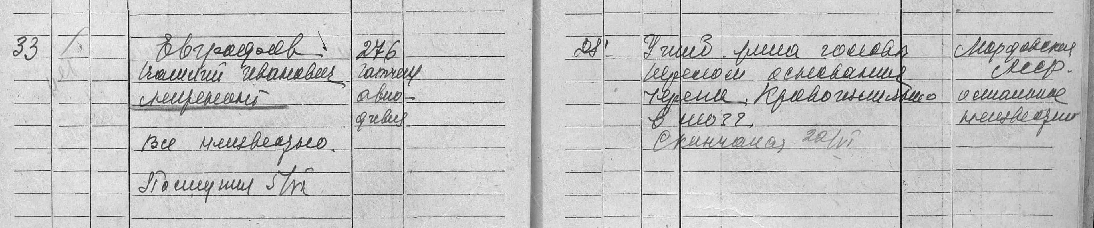 «…Евграфов Василий Иванович, лейтенант, 276-я Гатчинская авиадивизия. Больше неизвестно. Поступил 5 июня 1944 года. Ушибленная рана головы, перелом основания черепа, кровоизлияние в мозг. Скончался 20 июня 1944 года. Адрес родственников: Мордовская АССР, остальное неизвестно…»