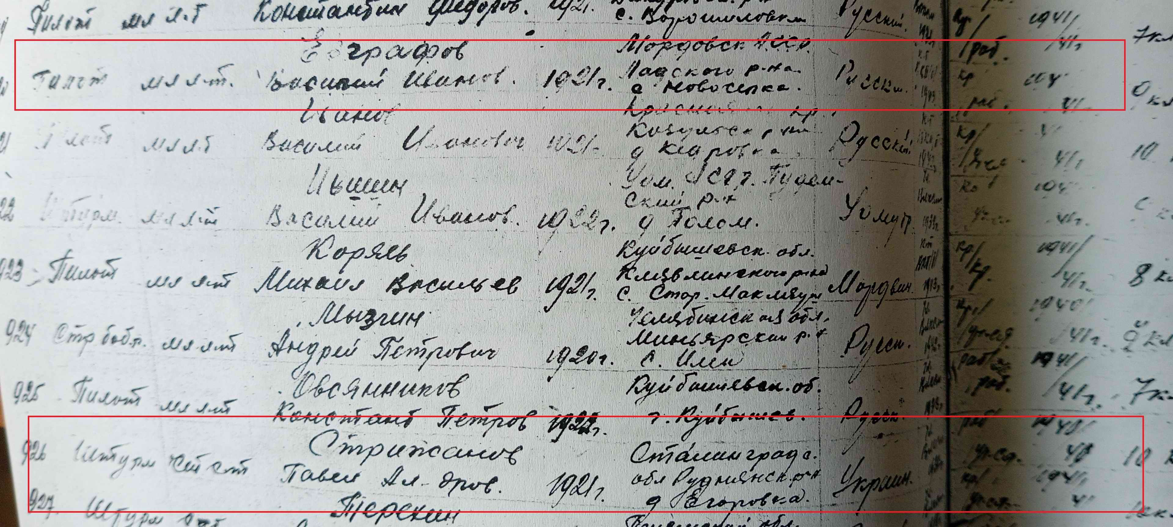 Дальнейший поиск, был направлен на установление полных данных летчика самолета. Напомним, что в документах были указаны только его фамилия и инициалы «Евграфов В.И.», но мы точно знали, что он имел первоочередное офицерское звание – младший лейтенант. Поэтому в первую очередь были проверены учетно-послужные документы офицеров, где и удалось найти его карточку. В УПК говорилось, что Василий Иванович Евграфов, 1921 года рождения, уроженец села Новоселки Чамзинского района Мордовской АССР. В июле 1941 года был мобилизован в Красную Армию. Проходил службу в составе 9-го запасного авиационного полка (г.Казань). Последним местом службы было отмечено – Управление 13-й Воздушной армии. Значился пропавшим без вести в августе 1944 года. Из этого документа выходило, что дальнейшая его судьба неизвестна. Но, вернувшись к книге учета умерших в 396-м эвакуационным госпитале, который дислоцировался в городе Ярославле, мы нашли запись: