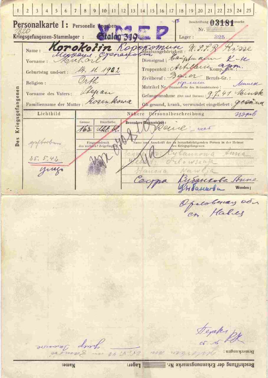По данным учета офицерского состава Красной Армии значится пропавшим без вести в июне 1941 года. Но после окончания войны, когда в руки наших войск попали многие трофейные документы немцев, удалось узнать, что капитан Корокотин попал в плен 9 июля 1941 года под Минском. В плену находился в Шталаге №325, который находился в Рава-Русская на территории Украинской ССР. Но в Рава-Русской находился центральный лагерь, а его филиалы с таким же номером 325 были расположены и в других местах. Из воспоминаний выживших и вернувшихся из плена бывших военнослужащих Западного фронта, попавших в плен на территории Белоруссии, известно, что они содержались в трех филиалах Шталага №325, которые находились в Замостье (Польша).
