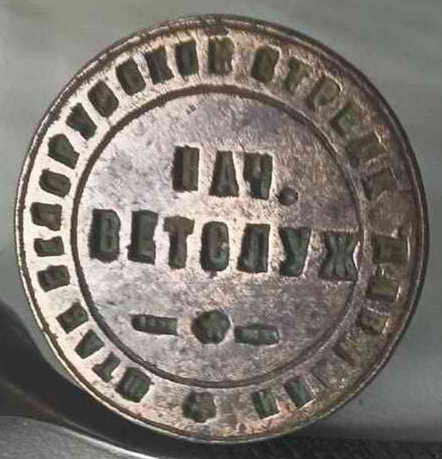 Теперь давайте перенесемся в район города Волковыска. Именно здесь, на окраине, так называемого Замкового леса, один из жителей города обнаружил еще одну печать, которую сейчас передал поисковикам группы «Батьковщина». На данной печати четко читается: «Штаб Белорусской стрелк. дивизии. Нач. ветслуж.».