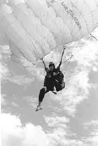 По инструкции нужно поднять голову и посмотреть в правильном ли положении раскрыт купол, не перехлестнулись ли стропы. Я пытаюсь это сделать, огромный шлем съезжает мне на глаза, и я ничего не вижу. “Эх, Бог с ним. Я плавно, совсем незаметно спускаюсь вниз. Значит, всё ОК!”