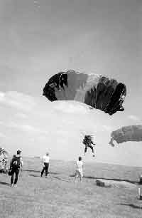 И я приземляюсь, опрокидываюсь на спину, раскрытый, наполненный воздухом купол тащит меня по земле (не очень-то приятно, скажу я вам). Я хватаюсь за нижнюю стропу и тащу её на себя. Купол потушен. Я на Земле и я выдержала экзамен на самопроверку.