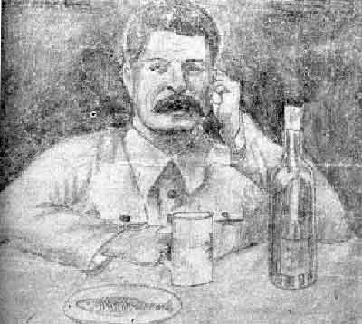 22 апреля с/г в райаппарат информатором райкома т. Никитиной доставлен портрет т. Сталина, нарисованный умело, четко, со значительным сходством лица, рукой человека, занимающегося рисованием. На листе, немного больше половины листа тетради, изображен т. Сталин, сидящий за столом в раздумье, одна рука - левая приставлена к голове, а правой держит кружку, на столе стоит бутылка с вином (как видно) и на тарелке лежит сухая, одни кости, селедка.