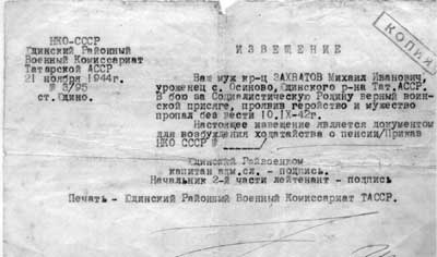 «В случае моей смерти сообщить ТАССР Юдинский район с.Осиново Захватовой