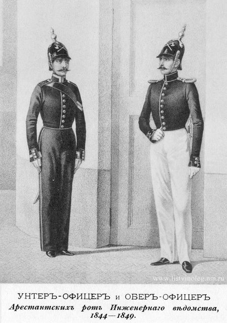 Что касается офицеров роты, то ими были как правило люди выслужившиеся из нижних чинов. При императоре Николае I нижние чины прослужившие в армии 20 лет при условии беспорочности службы могли уволится из армии и стать бессрочноотпускными или сдать экзамены на первый офицерский чин. В начале 50-х годов из 4-х офицеров роты 1 происходил из крестьян, 2 из солдатских детей и 1 из дворян. Мы располагаем формулярными списками двух офицеров роты. Наибольший интерес вызывает один из них Астер Ермухаметьев. Во первых — необычна запись о его происхождении, он назван крестьянином российской нации магометанского вероисповедания. Во вторых — офицер-мусульманин в николаевской России факт довольно редкий. Ермухаметьев был призван на службу в Балтийский флот в 1805 году матросом 1-й статьи. В том же году он становится матросом 2-й статьи. В 1812 году участвует в Отечественной войне с Наполеоном и заграничных походах русской армии, награждается серебряной медалью за 1812 год и медалью за взятие Парижа. В 1813 году назначается квартирмейстером, а в 1826 после 20 лет службы помощником шкипера в унтер-офицерском звании. Видимо Астер был отличным специалистом, потому что в последующие 4 года он три раза повышается в звании и в 1832 году уже поручик. Однако тяготы многолетней морской службы подорвали здоровье офицера. 27 февраля 1837 года он увольняется в отставку с чином штабс-капитана и пенсией в 400 рублей в год и возвращается на родину. Но на пенсию младшего офицера прожить довольно сложно и Ермухаметьев в ноябре 1841 года поступает в чине поручика в Казанскую арестантскую роту, которой командует до 1846 года (1-2-414).