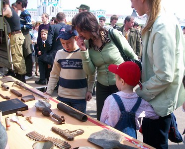 Народ быстро расходился, и мы поехали на Ярмарочную площадь посмотреть на наших мальчишек участвующих в параде. У нас была представлена небольшая экспозиция находок с мест боев Времен Великой Отечествен-ной войны и ребята рассказы-вали об экспонатах. Мне нравиться держать в руках такие находки, у каждой своя судьба, своя история, такое ощущение, что ты прикасаешься к тому, военному времени.