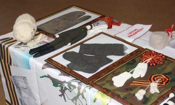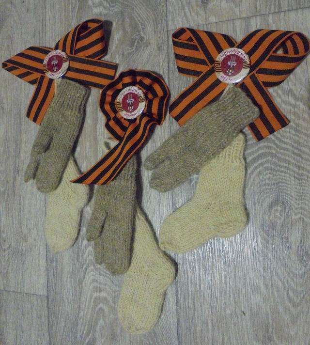 По возвращении из экспедиции тканевые остатки трехпалой рукавицы были восстановлены. Появилась идея проекта «Оренбуржье - фронту». Мы предложили вывязывать подобные мини- рукавички и носочки и крепить их на Георгиевскую ленточку. К реализации проекта присоединились Оренбургский педагогический университет, школы города. Изготовленные сувениры в дни праздничных мероприятий поисковики дарили ветеранам, труженикам тыла в память о работе, которая велась в тылу.