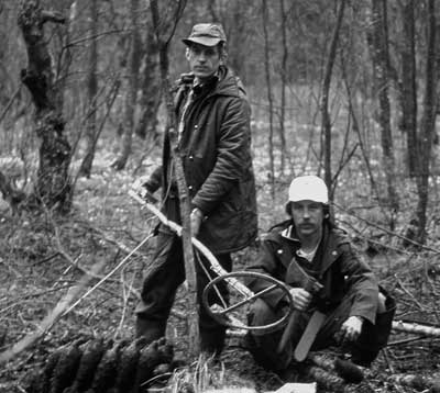 Крюк. В поисковом мире широкую популярность в качестве вспомогательного инструмента для установления факта наличия останков стал крюк. Это металлический пруток, изогнутый с одной стороны в виде небольшого крючка. Изготавливают его из металла, аналогичного для глубинного щупа, в двух вариантах. Так называемые стационарный и насадной. Первый вариант — это крюк произвольной длины (по желанию владельца) с приваренной стальной трубкой-ручкой на втором конце прутка. Обычно берут длину от 1,5 до 2,5 метров. Такая длина крюка позволяет исследовать воронки мелкого и среднего диаметра. Слишком длинные крюки затруднительны в транспортировке, особенно когда приходится добираться к месту поисковых работ общественным транспортом. Другой вариант, так называемый насадной, укороченный крюк — с небольшим, вместо ручки, крепежным загибом около 2 см. Конец крепежного загиба лучше заточить в виде отвертки, причем так, чтобы он при креплении к шесту вбивался в древесину поперек ее волокон. Такой крюк изготавливают длиной 1,3–1, 5 метра. Главное его преимущество — возможность исследования любого диаметра и любой глубины воронки. Для этого, в зависимости от необходимости, непосредственно на месте поисковых работ вырубают нужной длины шест, желательно из тонкой березы. С комлевой стороны шест затесывают на длину 40–50 см и в накладку прикрепляют крючок, забивая загиб в древесину и закрепляя по всей длине место соприкосновения крюка и шеста металлическими скобками и проволокой или прочной веревкой. Рабочий загиб крюка выполняют овалом, диаметром 3–5 см, по индивидуальному желанию. При этом следует помнить, что чем больше диаметр загиба, тем труднее будет пробить слой слежавшегося грунта над залеганием костных останков или других имеющихся на дне воронки предметов и сложнее зацепить какой либо предмет. Изготавливать такой крюк лучше из пружинистой катанной стали, толщиной 8–10 мм. Опытные поисковики предпочитают иметь оба варианта крюков. Однако, более часто приходится все же исследовать грунт в таких местах, где достаточно длины стационарного инструмента. Крюк с приваренной металлической ручкой значительно легче и удобнее при движении по лесу. В ходе поиска и обследования небольших воронок крупные воронки практичнее «брать на заметку», а в последствии уже целенаправленно обследовать насадным крюком.