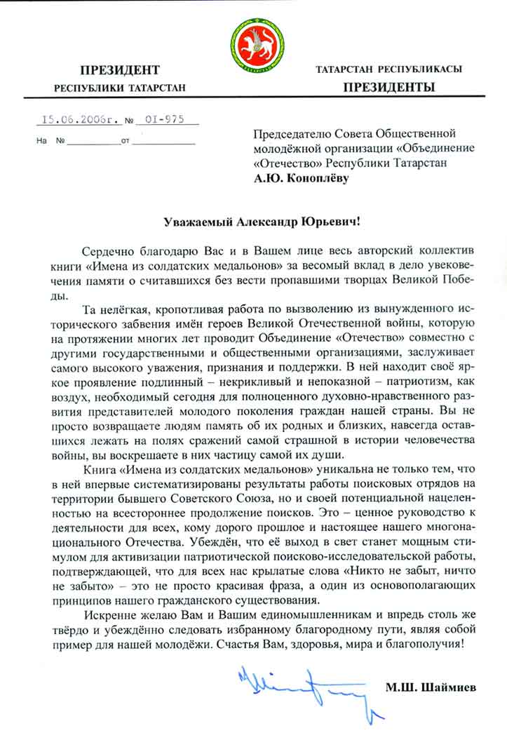 Благодарственное письмо Президента Республики Татарстан М.Ш.Шаймиева авторскому коллективу книги.