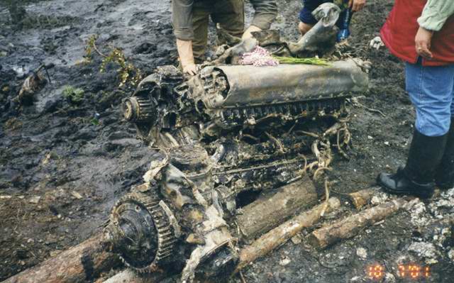 В августе 2001 года сводной поисковой экспедицией отрядов "Невский Пятачок", "Высота" (г. Санкт-Петербург, руководитель Виктор Николаевич Дудин), "Наследие" (г. Иркутск, руководитель Георгий Вадимович Куприянов) проведены работы по подъему самолета. На поверхность, с глубины более семи метров поднят мотор самолета и установлен его заводской номер: "MERLIN XX № 50833/243137. Останков пилота не обнаружено. Самолет упал в районе расположения наших наземных частей и, скорее всего, пилота достали и захоронили еще в годы войны. В том числе на это указывает, то, что среди обломков была обнаружена разорванная часть от планшетки, которая была зажата металлом.