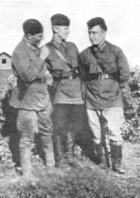 Один из лучших авиаразведывательных экипажей (слева направо): штурман В.А.Николаев, летчик Н.Ф.Гончар, стрелок-радист Ф.Емельянов.