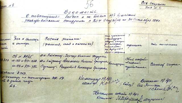 Экипаж самолета СБ (заводской номер 20/65) с моторами М-103 (№/№ 913-1032, 933-786) при выполнении боевого задания 29 сентября 1941 года был подбит в районе цели, тянул на свой аэродром. Штурман и воздушный стрелок-радист были тяжело ранены или убиты еще в воздухе. При подходе к аэродрому самолет стал неуправляем, летчик выпрыгнул на парашюте. Самолет упал в районе м. Озерки в Парголовском районе Ленинградской области (в настоящее время - черта города Санкт-Петербург).