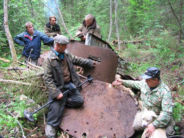 Павел Ворона и Геннадий Филиппов у обломков самолета майора Горшкова, на броневом листе обнаружена бирка с номером.