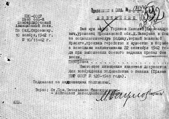 Горшков Николай Александрович, майор, 446 бомбардировочный авиаполк. Родственники проживали: Читинская область. Уроженец: Ярославская область д. Макарено. Пропал без вести 22 сентября 1942 года. Приказ ГУК НКО № 0491-3 от 07.07.43г.
