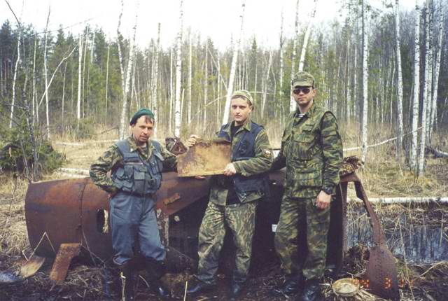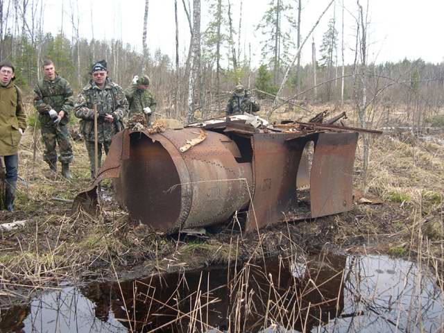 На краю вырубки лежала на половину перевернутая "бочка" от бронированной кабины штурмовика Ил-2. Мы давно слышали об этом месте падения самолете. Еще при жизни Василия Ивановича Груздова (поисковика из города Тосно, он умер от тяжелой болезни в 2003 году), мы вместе пытались найти этот самолет. О нем, говорили Василию Ивановичу лесники. Но, тогда, в 2000 году проплутав целый день в лесу, мы ни чего не нашли. И вот мы были на том месте, куда стремились несколько лет. И вот сейчас, мы вышли на эту вырубку. Александр Коноплев - председатель Совета поискового объединения Республики Татарстан "Отечество", руководитель Межрегиональной поисковой экспедиции "Любань", прекрасно знающий тосненскую землю не только по старым военным картам, но и истоптавший своими ногами территорию бывшей полосы наступления 54-й армии Волховского фронта, буквально за час вывел нас от дороги на место падения самолета. Не пощадило самолет послевоенное время. На голой, заболоченной поляне лежала только бронированная "капсула" кабины - ни крыльев, ни мотора, ни стоек шасси рядом не было. Скорее всего, эти обломки уже давно были сданы в металлолом и были переплавлены для нужд великой страны.