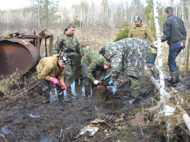 Эта картина - видение, пришла позже. Тогда, когда мы усталые и вымокшие, уже сидели на бивуаке ижевского отряда "Долг", пройдя по заболоченной вырубке и разбитой лесовозами старой дороге. Фаиль Ибрагимов - руководитель Удмуртского республиканского объединения гостеприимно угощал нас горячим, обжигающим чаем. Обеспечив нас кружками, Фаиль извлек из палатки алюминиевую фляжку с водкой. Это лекарство привычно разлилось в большую эмалированную кружку, и из рук в руки пошла по кругу. Только водка могла согреть наши продрогшие души. Стянув с себя промокшие от влаги и пота лесные куртки и расставив у костра отяжелевшие "берцы" и "бродни", мы вытянули ближе к огню посиневшие голые ноги. Первый круг кружки прошел "за встречу", не так уж и часто мы встречаемся, и было приятно увидеть лица давно знакомых друзей по поиску. Фаиль, из Ижевска, Александр Коноплев из Казани, Иван Дьяков из Вологды и мы (Виктор Костюкович и Илья Прокофьев) из Питера - вот и в сборе наш большой поисковый союз. Второй круг прошел за здоровье. А вот на третьем - святом для всех поисковиков, стоя в молчаливом кругу и прошептал кто-то из нас - "...И за этого сгоревшего летчика...".