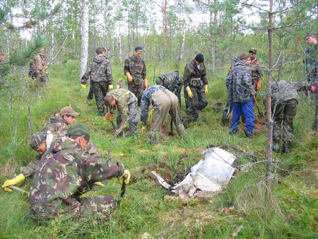 Очищая края воронки, ребята обнаружили остатки двух унт одного из членов экипажа самолета, а в них - оторванные от страшного взрыва фрагменты ног. На протяжении всего рабочего дня в одном из краев воронки постоянно попадались сильно разбитые человеческие останки - таза, ног и рук. Из-под мха извлекли обрывки летного шлема с одним наушником, а в нем фрагменты черепа... Среди искореженного алюминия попадались оборванные стропы и лоскуты парашютного шелка. Это говорило о том, что при падении самолет взорвался. Найденные в обломках осколки и взрыватели от 100-килограммовых авиационных бомб, говорили о том, что при падении детонировали бомбы, находящиеся на борту самолета.