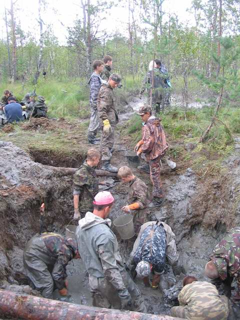 Ежегодно к нам в Ленинградскую область приезжают поисковики из Новосибирска - отряд "Мужество, Героизм и Воля" воспитанники Сибирского кадетского корпуса под руководством Натальи Изотовны Некрасовой. Уже на протяжении более 10 лет новосибирцы совместно с поисковиками Ленинградской области принимают участие в экспедициях по поиску и подъему обломков советских самолетов. Мы и в этот раз пригласили наших друзей провести совместную экспедицию, рассказав Наталье Изотовне и ее ребятам о находке нурминских поисковиков на Еременском болоте. Сибиряки согласились нам помочь. И вот 28 августа сводная экспедиция в составе новосибирского "МГИВа" и питерского "Рубина" отправилась к месту падения самолета. В течение нескольких часов пришлось пропиливать старую дорогу, заваленную свалившимися деревьями, для того, чтобы по ней смог пробиться единственный у нас в то время "уазик", заполненный шанцевым инструментом, оборудованием, питьевой водой и продуктами. Остальные участники экспедиции проделали путь в несколько километров пешком, постоянно вытаскивая и подталкивая "УАЗ", застревающий в болотистых местах. Выйдя на место падения самолета, и оперативно развернув небольшой лагерь, ребята приступили к работе. Сначала убрали мох, которым заросла вся поверхность большой воронки на болоте. На это ушло несколько часов трудоемкой работы. Постоянно среди мха и корней попадались различные мелкие обломки самолета, его хвостового оперения. После очистки воронки ото мха, стали откачивать воду. Работала небольшая переносная помпа, однако всплывающий торф приходилось постоянно откачивать ведрами. Для этого большинство поисковиков разделились на две цепочки, и стали передавать ведра, наполненные водой и торфом. Глубина болота оказалась не более полутора метров, поэтому, дойдя до дна болота, ребята взялись за лопаты. Через некоторое время глина, смешанная с песком и водой стала превращаться в супесь, и в воронке образовался плывун. Добиться полного отсутствия воды в воронке не представлялось возможным, вода постоянно прибывала из болота, шел нудный моросящий дождь. Но, несмотря на эти трудности, в первый день работы было сделано много. Была полностью очищена вся площадь воронки от мха и корней, удалось углубиться больше чем на два метра в одной из частей воронки. И самое главное - при разборе вытаскиваемой из воронки глины были обнаружены два фрагмента человеческого черепа, что говорило о том, что экипаж самолета погиб вместе с самолетом.