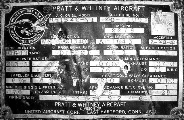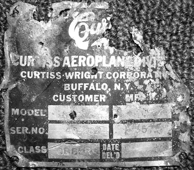 Тем самым, мы определили фирму изготовитель данной машины. Зная, что на самолетах Р-39 "Аэрокобра" стояли крупнокалиберные пулеметы, мы пришли к выводу, что, возможно, нами найден один из вариантов самолета Р-40 "Киттихаук". Но следующая находка, обнаруженная в последующею проездку, нас сильно озадачила. Нами была найдены шильда с номером двигателя: PRATT & WHITNEY AIRCRAFT R - 1340-51 № 8879.