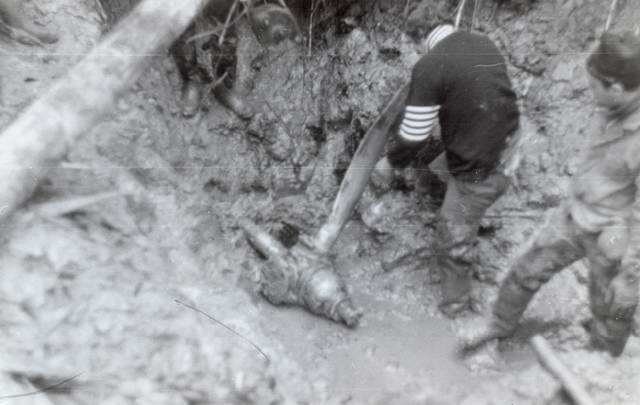 Уже минут пятнадцать, Андрей пытался руками вытащить из ямы какой-то большой и массивный агрегат самолета. Нам удалось расшатать "агрегат", но болото упорно не хотело отдавать эту часть самолета в наши руки.