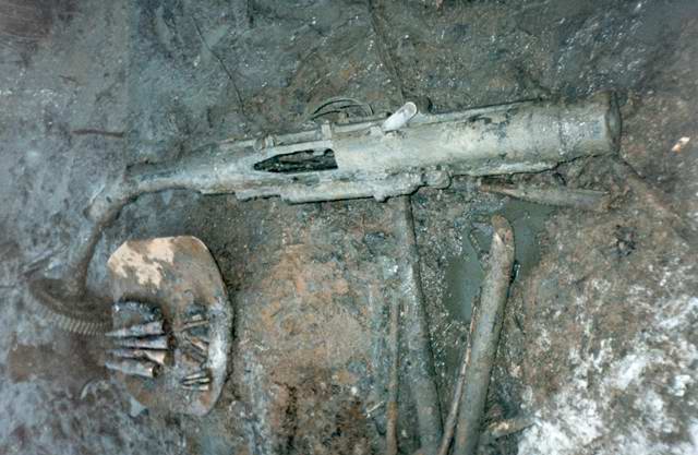 Кингисеппские коллеги к моменту нашего приезда сделали уже многое: полностью откачена ведрами вода из воронки, на поверхности, у бивака поисковиков, разложены вытащенные из земли обломки самолета - куски дюраля, ржавая бронеспинка, загнутая под 90* авиационная пушка. С первого же взгляда узнаем ОКБ-37 - это 37 мм авиационная пушка, которая устанавливалась в основном на самолеты Як-9т и на небольшую серию Ил-2. Но по всем признакам и обломкам ясно, что перед нами место падения самолета Як-9т.