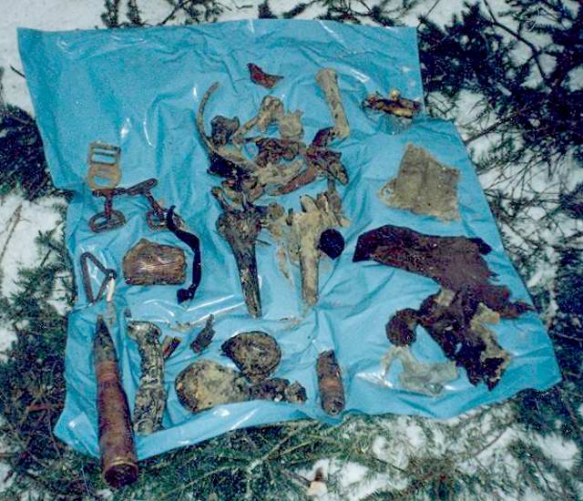 4 декабря 2003 года. При дальнейших работах из воронки были подняты: спинка бронекресла, крючки и пряжки от привязных ремней парашюта, кусок кожаного ремня, носовая часть обуви, костные останки летчика (кости таза, кости ног, кости рук, часть грудной клетки и позвоночника, часть нижней челюсти), рукоятка штурвала (дата выпуска 1943 год), авиапушка НС-37 № НЛ 662 (ствол загнут), казенная часть пулемета УБ № РЖ 214 (разбит), 37 мм снаряды с маркировкой 1943 года, патроны в ленте калибра 12,7 мм, стрелянные гильзы калибра 7,62 мм с маркировкой 1941-1943 годов, разбитые приборы, стартер с № 415-1979, поршень двигателя М-105 ПФ с дублированным номером мотора: 415-1979. Часть останков пилота находилась в районе двигателя, а большая часть останков находилась в центре воронки (в районе кабины)...".