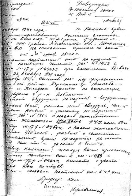 Следующий документ. "Акт. Январь 1940 года. Местечко Каннельярви. Мы, нижеподписавшиеся, Комиссия в составе следующих: старшего техника отряда воентехника 1 ранга Рудынко М., воентехника 1 ранга Толстикова Н., механика ... (фамилия не читается), на основании приказа по части от 30 января 1940 года составили настоящий акт на предмет списания погибшего самолета ССС № 1453 с мотором М-17ф № 04632 при выполнении боевого задания 23 декабря 1939 года. 23 декабря 1939 года самолет ССС под управлением летчика старшего лейтенанта Перелыгина Гр., летнаба лейтенанта т. Насадюк вылетели на выполнение боевого задания в район Бабошино. В результате воздушного нападения и воздушного боя самолет сбит, экипаж погиб в воздухе, самолет при падении разбит и ремонту не подлежит. Самолет ССС № 1453 с начала эксплуатации налетал 342 часа 56 минут. Мотор М-17ф № 04632 с начала эксплуатации отработал 416 часов, разбит с самолетом. В настоящее время находится на месте падения самолета и засосан в болото. Вывод комиссии: исходя вышеизложенного комиссия считает самолет ССС № 1453 и мотор М-17ф № 04632 списать с учета 16 КАО как погибшие, о чем и составлен настоящий акт...".