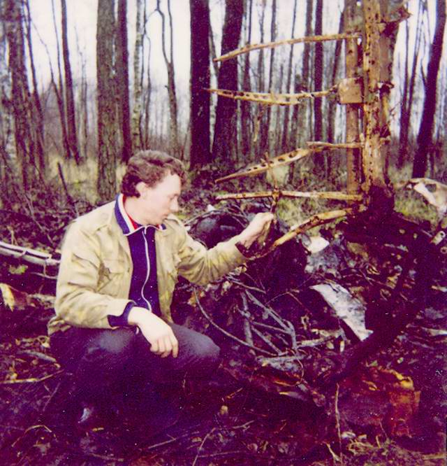 Командир поискового отряда «Невский пятачок» Мельниченко Сергей Викентьевич изучает обломки самолета В.И.Петрова.