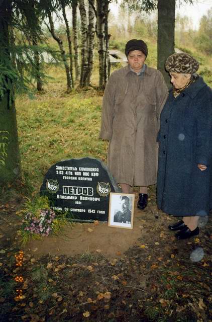 Проведя архивную исследовательскую работу, было установлено, что погибшего гвардии капитана В.И. Петрова захоронили в поселке Невская Дубровка еще в годы Великой Отечественной войны воины пехотной части, в расположении которой упал самолет Петрова. Но, как выяснилось позже, его имя не было увековечено на воинском мемориале, отстроенном в послевоенное время на месте воинского захоронения. Проведя большую работу, удалось разыскать родных и близких капитана Петрова, его внучатую племянницу. Работа по поиску родных была осложнена тем, что поисковики знали, что еще в годы войны, когда Малая Вишера была оккупирована немецкими войсками, фашисты целенаправленно нашли родителей Владимира Петрова и расстреляли их на глазах всего города - как родственников офицера и летчика Красной Армии.