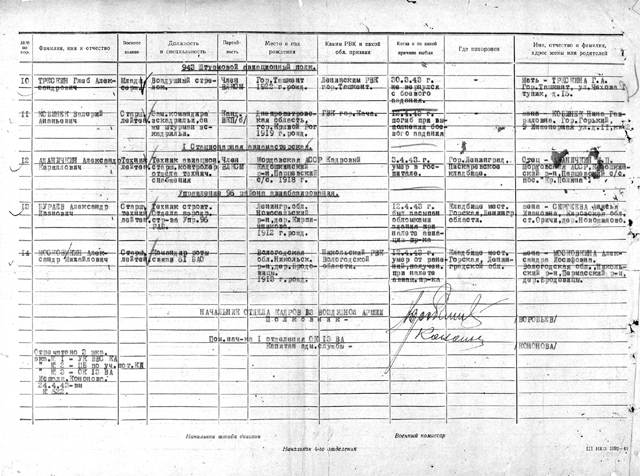 Воздушный стрелок 943-го штурмового авиаполка 277-й штурмовой авиадивизии 13-й Воздушной армии Ленинградского фронта младший сержант ТРЕСКИН Глеб Александрович, 1922 г.р., уроженец: Узбекская ССР, город Ташкент, ул. Чехова, 1-й тупик, д. 15. Мать Трескина Г.А. Мобилизован Ленинским РВК города Ташкента.
