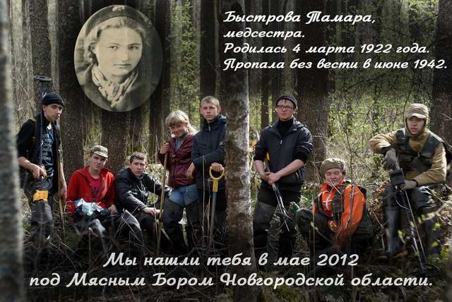 Найдена: май 2012 г., Новгородская обл., д.Мясной Бор. Захоронена: 8.5.2012 г., Новгородская обл., Новгородский р-н, д.Мясной Бор. Отряд: п/о "Гвардия"-"Шкраб", г.Великий Новгород.