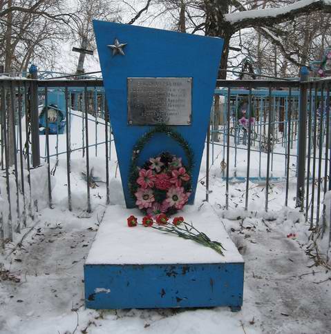 Захоронение размерами 3х2 м в ограде из металлической решетки находится в центральной части кладбища. Металлический памятник общей высотой 1,4 и шириной 0,8 м установлен в 1985 году. На памятнике размещена табличка с надписью на русском языке «Братская могила. Здесь похоронены летчики л-т Ермаков Михаил, л-т Кольцов Аркадий, л-т Лобинцев Дмитрий. Погибли 11.02.1944 года. Вечная Вам Слава!».