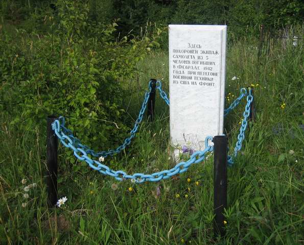 Захоронение размерами 1,45х1 м, ограждение сделано из металлических цепей на столбиках. Памятник в виде белой мраморной плиты высотой 1,1 и шириной 0,45 м со цветником 1,4х0,6 м. На памятнике сделана надпись на русском языке «Здесь похоронен экипаж самолета из 5 человек, погибших в феврале 1942 года при перегоне военной техники из США на фронт».