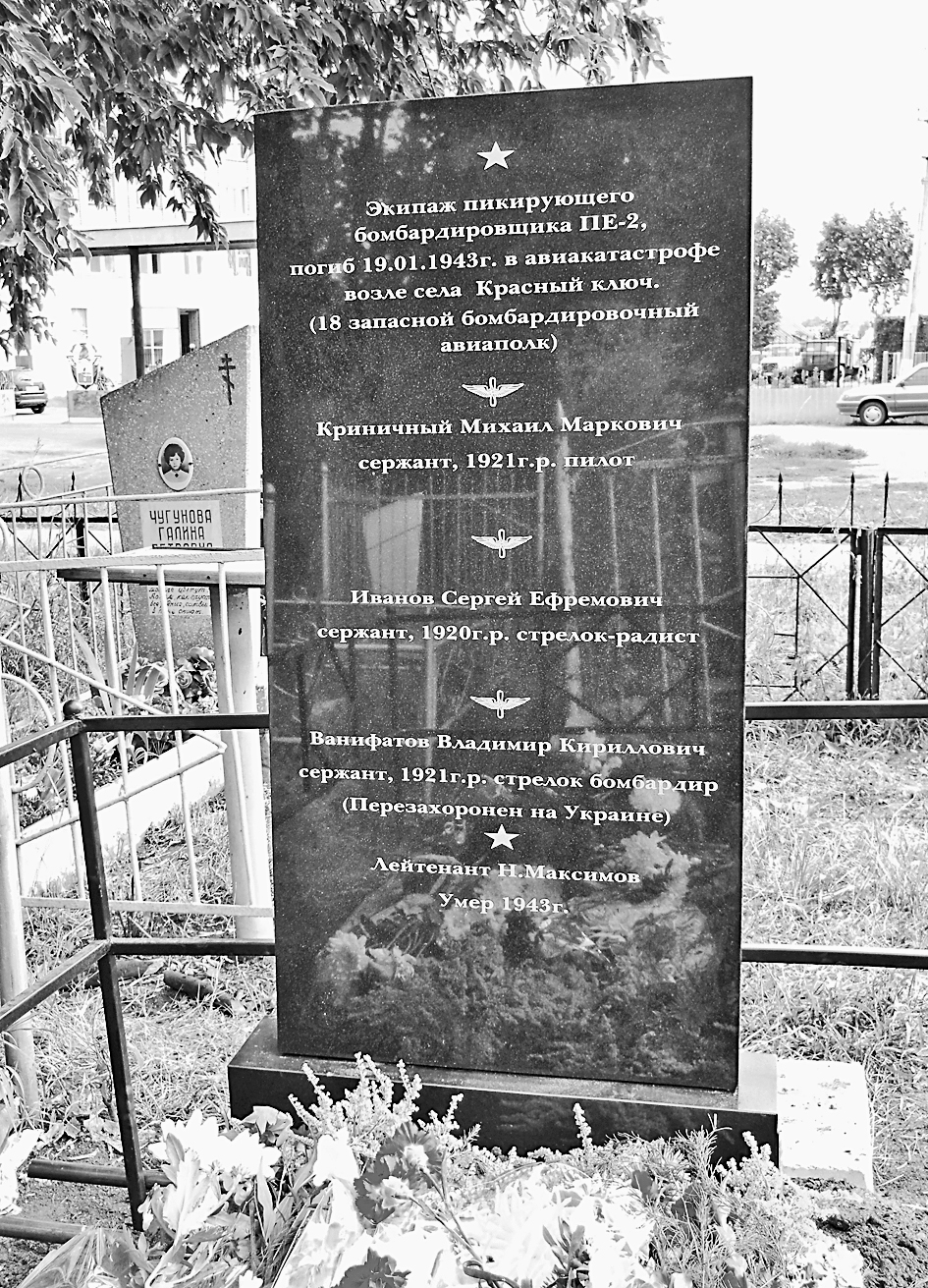 Погиб 19 января 1943 года при катастрофе самолета Пе-2 (заводской номер 2/119) в районе дер. Красный Ключ (район города Чистополь) во время выполнения учебного полета. В составе экипажа погибли: летчик, сержант Криничный М.М., штурман самолета, старший сержант Ванифатов В.К., воздушный стрелок-радист, сержант Иванов С.Е.