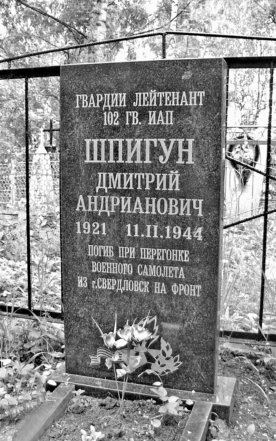 По проведенной исследовательской работе с архивными документами Управления ЗАГС Республики Татарстан установлено, что в документах Нижнеуслонского сельсовета Верхнеуслонского района есть запись акта смерти о смерти Шпигуна Дмитрия Андриановича, датированная 4 мая 1944 года. При опросе местных жителей выяснилось, что тело погибшего летчика было обнаружено в обломках самолета под стаявшим снегом в мае 1944 года и его останки были захоронены на сельском кладбище в селе Нижний Услон. В связи с тем, что документы летчика пострадали от долгого нахождения в обломках самолета, на могиле погибшего были допущены ошибки в написании его данных. В советское время за могилой ухаживали учителя и ученики Нижнеуслонской средней школы. В постсоветское время могила оставалась без должного ухода.