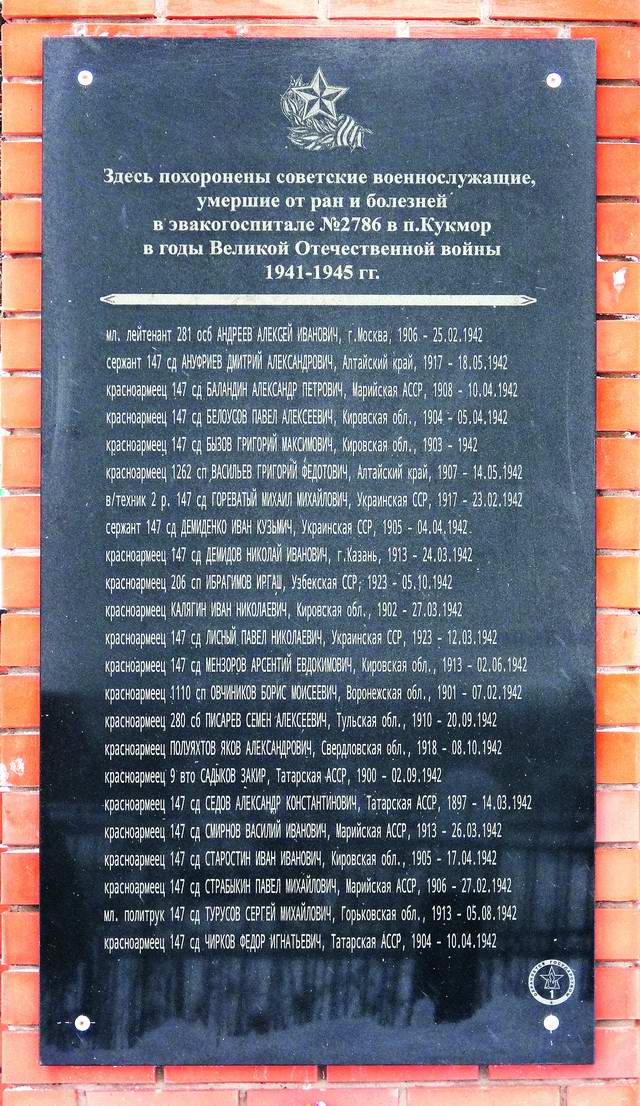 Захоронение размерами 6,4х6,6 м. Памятник высотой 2,65 м и общей шириной 2,6 м изготовлен из красного кирпича. На памятнике размещены изображение ордена Отечественной войны и мемориальная плита из черного гранита размерами 1,7х0,9 м с надписью на русском языке «Здесь похоронены советские военнослужащие, умершие от ран и болезней в эвакогоспитале №2786 в п.Кукмор в годы Великой Отечественной войны 1941–1945 гг.» и списком с указанием воинского звания, фамилии, имени, отчества, области места рождения, года рождения и даты смерти 23 похороненных.