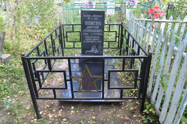 Захоронение размерами 2,5х2 м в металлической ограде. Памятник из черной гранитной плиты высотой 1,2 и шириной 0,6 м на гранитном основании 1,8х1 м установлен 3.5.2012, реконструирован в 2015 г. На памятнике сделана надпись на русском языке «Гвардии лейтенант 102 гв. иап ШПИГУН Дмитрий Андрианович, 1921 – 11.II.1944 погиб при перегонке военного самолета из г.Свердловск на фронт».