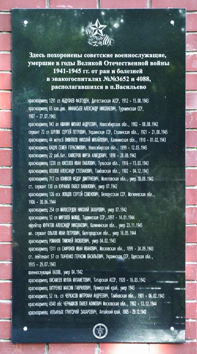 Захоронение размерами 4х4 м, ограждение из металлических секций высотой 0,5 м. Памятник высотой 3 м и общей шириной 2,6 м изготовлен из красного кирпича. На памятнике размещены изображение ордена Отечественной войны и мемориальная плита из черного гранита размерами 1,7х0,9 м с надписью на русском языке «Здесь похоронены советские военнослужащие, умершие в годы Великой Отечественной войны 1941–1945 гг. от ран и болезней в эвакогос­питалях № 3652 и № 4088, располагавшихся в п.Васильево» и списком с указанием воинского звания, фамилии, имени, отчества, области места рождения, года рождения и даты смерти 25 похороненных.