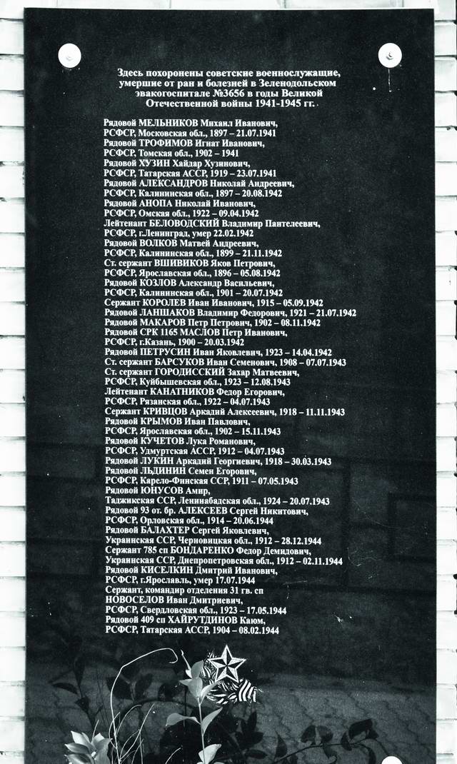 Захоронение размерами 7х4 м, в металлической ограде. Памятник высотой 3 м и шириной 1 м изготовлен из кирпича песочного цвета. На памятнике размещены изображение ордена Отечественной войны и мемориальная плита из черного гранита размерами 1,7х0,9 м с надписью на русском языке «Здесь похоронены советские военнослужащие, умершие от ран и болезней в Зеленодольском эвакогоспитале №3656 в годы Великой Отечественной войны 1941–1945 гг.» и списком с указанием воинского звания, фамилии, имени, отчества, области места рождения, года рождения и даты смерти 29 похороненных.