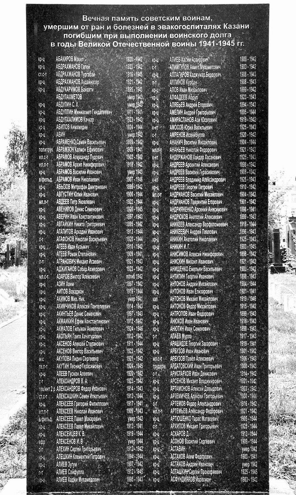 Сведения о похороненных в Татарстане воинах постоянно уточняются, за информацией обращайтесь в Всероссийский информационно-поисковый центр «Отечество» (г.Казань): телефон: +7-(843)-555-02-55, e-mail: mipc@mail.ru.