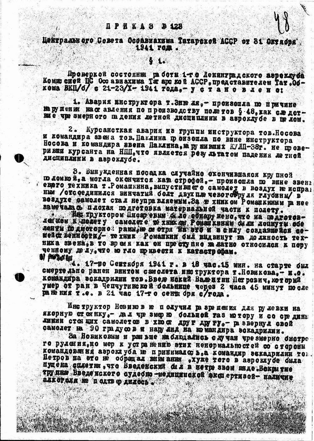 Обстоятельства гибели описаны в приказе № 123 Центрального Совета Осоавиахима Татарской АССР от 31 октября 1941 года: «…в 18 часов 15 минут на старте был смертельно ранен винтом самолета инструктора т.Новикова, умер от ран в Чепчугинской больнице через 2 часа 45 минут после ранения, т.е. в 21 час 17-го сентября 1941 года. Инструктор Новиков не получил разрешения для рулежки на якорную стоянку, дал чрезмерно большой газ мотору и с середины линии стоящих самолетов в хвост друг другу – развернул свой самолет на 90 градусов и нарулил на командира эскадрильи…».